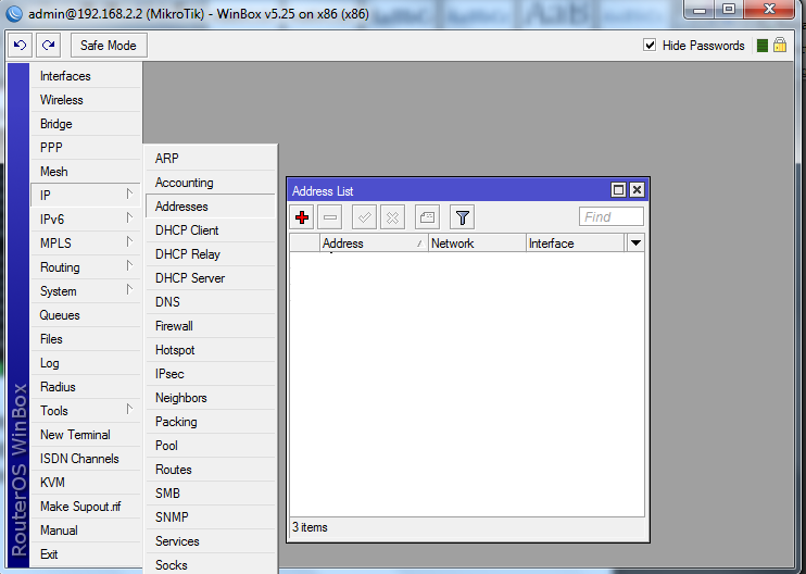 • Masuk pada tab IP --> Addresses, maka akan muncul sebuah box baru, klik add +